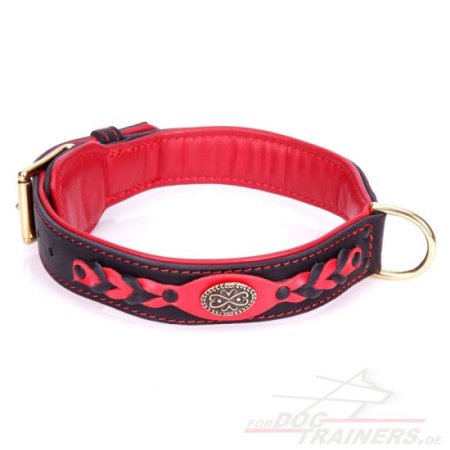 Schauen Sie sich dieses stilvolle Hundehalsband aus schwarzem und rotem Leder an! Unser stilvolles Hundehalsband ist aus rotem echtem Leder gefertigt und mit Zöpfen und goldfarbenen Platten verziert.