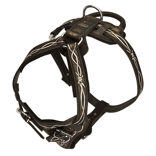 Dieses Geschirr ist mit bemalter Stil von Hand gefertigt und hat kräftiges Design. In diesem Ledergeschirr wird Ihr Hund immer zu einem Hingucker bei allen Hundeaktivitäten. Die Künstler unseres Betriebs wenden besondere wasserfeste universelle Farbe und eine Geheimtechnik an und machen dieses Geschirr zu einem einzigartigen Kunstwerk. Auch die restlichen Bestandteile des Hundegeschirrs sind wie üblich erstklassig. Das Geschirr für Hunde ist aus feinstem Leder für beste Qualität geschaffen und kann auch griffigen Griff aus besonders weichem, robustem Leder haben. Das Ledergeschirr ist auch verstellbar und hat hohe Stabilität. Das Geschirr für Hetz- und Sicherheitsarbeiten zeichnet sich durch seine hohe Widerstandsfähigkeit und seinen Tragekomfort aus. Von Hand angefertigtes Ledergeschirr aus hochqualitativem, extrem-widerstandsfähigem Leder bietet Ihnen enorme Strapazierfähigkeit. Es ist elastisch und scheuert die Haut Ihres Hundes nicht wund.