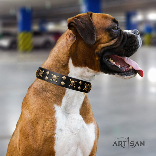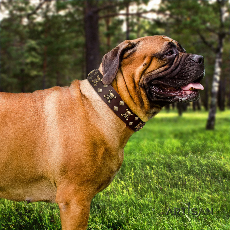 Einzigartiges robustes Leder Hundehalsband mit Schädeln und Rhomben